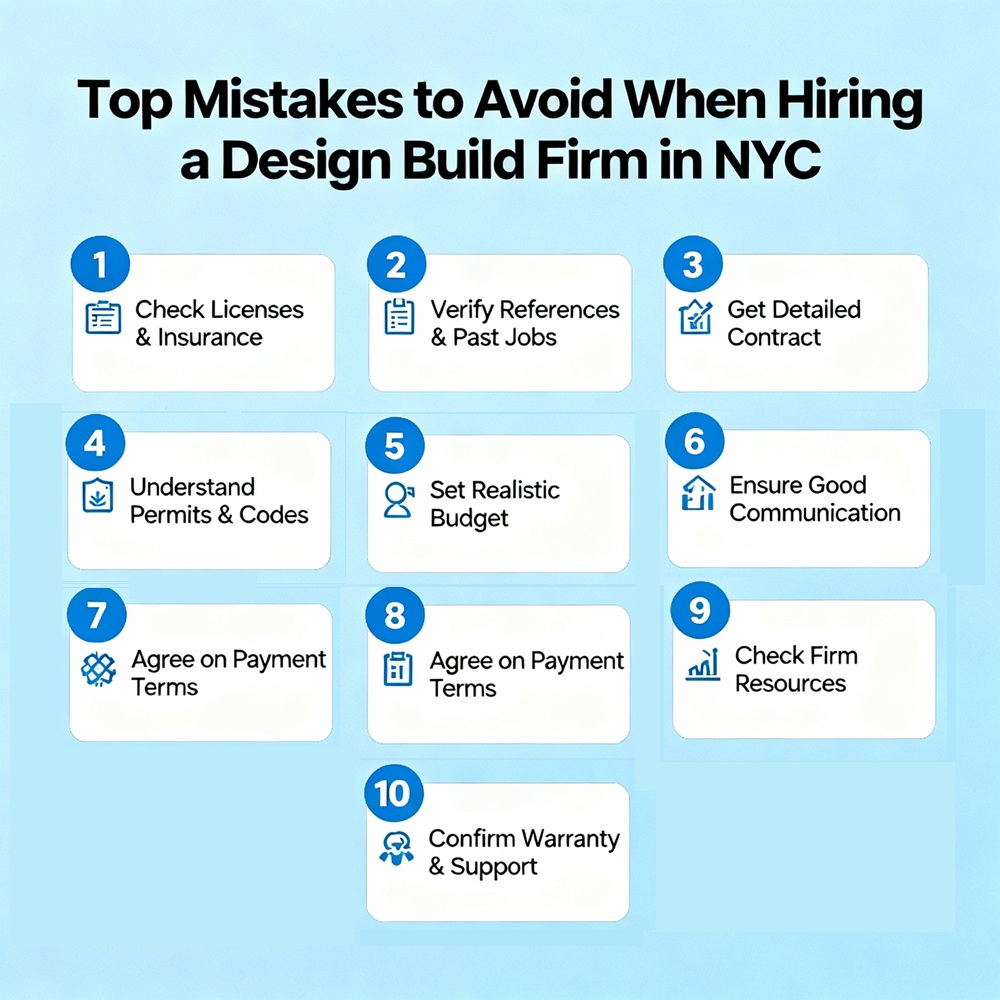 Avoiding common mistakes is key to hiring the best design build firm NYC. This ensures your project stays on track and within budget. Always check licenses and insurance, and look at references.